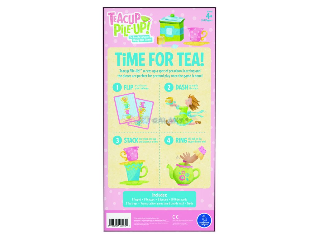 - Obsah balení: 8 plastových šálků, 4 podšálky, 10 karet s úkoly, konvička se zvonkem, 2 servírovací podnosy, box na skladování