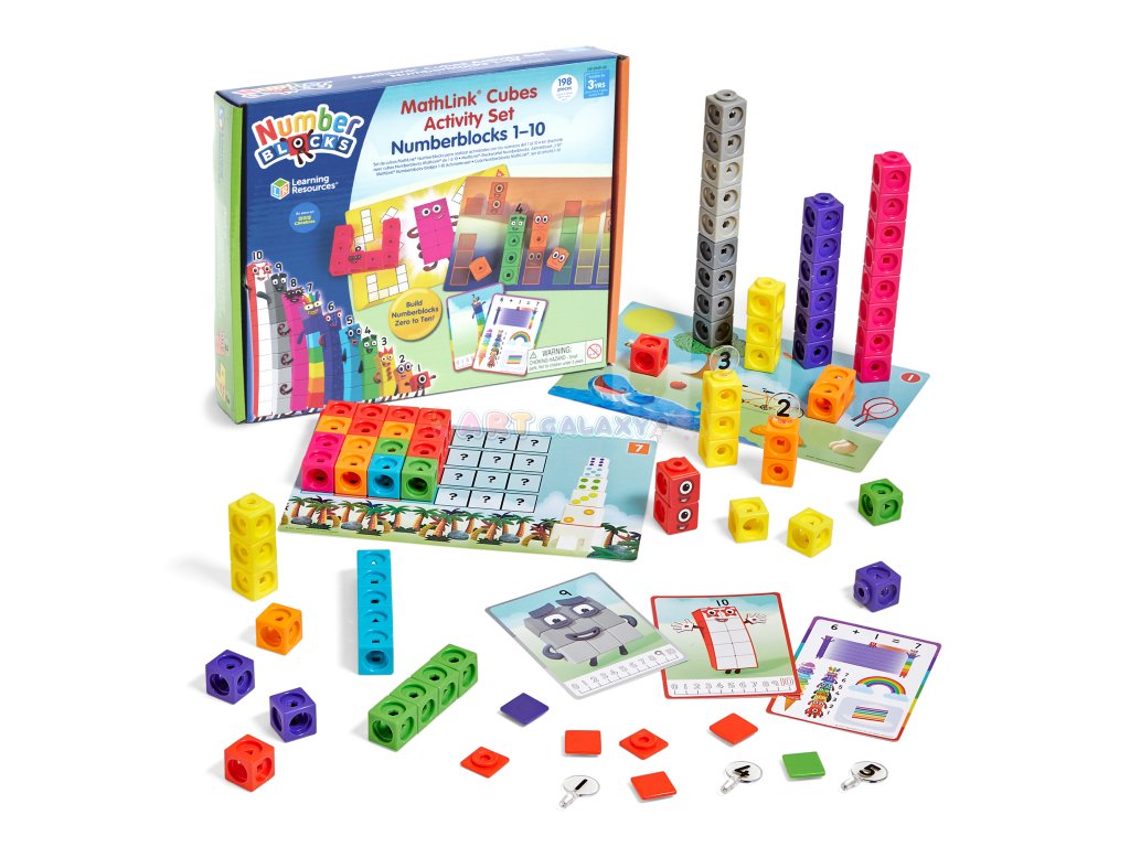 - Obsah sady: 100 MathLink® kostek, 59 čelních štítků, 54 samolepek, 11 číslic, 11 karet s postavami, 15 oboustranných karet s aktivitami (psát a stírat), stojan na nulu, průvodce aktivitami