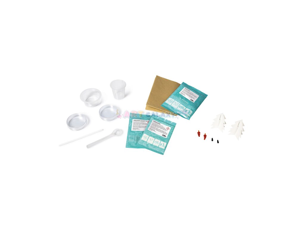 Ledová věda - plechovka obsahuje: 1 sáček sněhového prášku, 1 kus nepromokavého papíru, 2 kusy sněhulákova nosu, 2 kusy sněhulákových oček, 1 sáček s ledovými kostkami absorbujícími vodu, 1 sáček s mrazicím práškem, 1 odměrku, 1 kelímek, 1 lžičku, 1 míchátko, 2 Petriho misky a 4 části na vánoční stromeček.