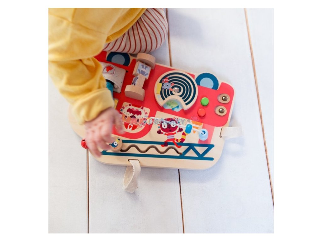 Tento dřevěný panel ve tvaru hasičského vozu nabízí spoustu aktivit a materiálů, které nejmenším dětem pomáhají objevovat svět kolem sebe. Podle nádherných ilustrací může maminka vyprávět příběh o hasičích a jejich náročné práci. Dřevěný panel lze díky páskům na suchý zip zavěsit třeba na postýlku. Děti si tak pohodlně mohou hrát a zároveň rozvíjet jemnou motoriku a smysly. Panel je vyroben z kvalitního dřeva, textilní části jsou ze 100% polyesteru a lze je prát v pračce na 30°C na jemný cyklus. Ideální věk pro hru s touto hračkou je od 9 měsíců. Rozměry panelu jsou 30 x 23 cm.