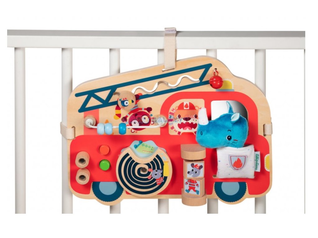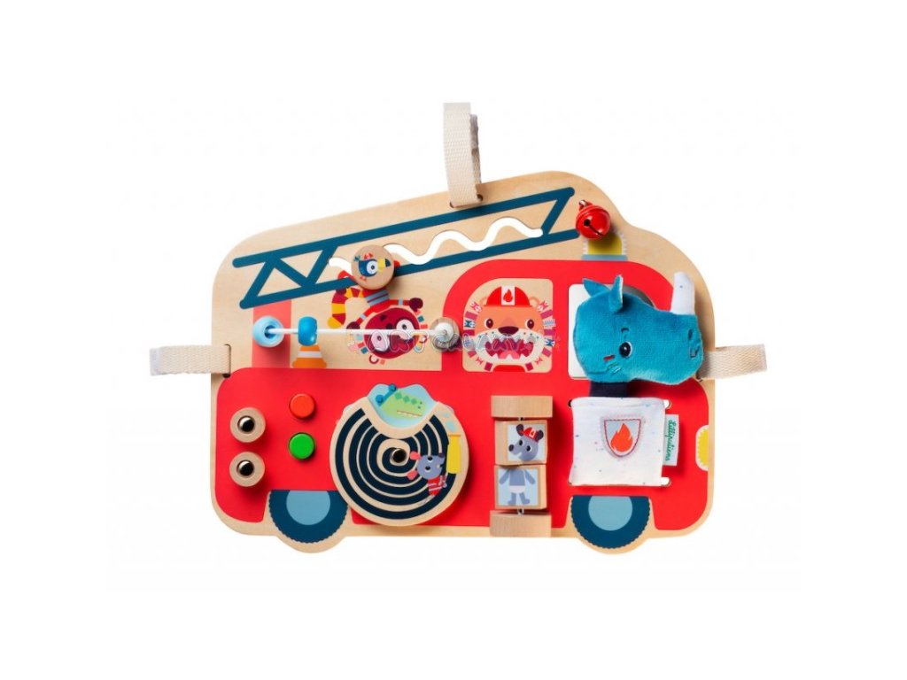Tento dřevěný panel ve tvaru hasičského vozu nabízí spoustu aktivit a materiálů, které nejmenším dětem pomáhají objevovat svět kolem sebe. Podle nádherných ilustrací může maminka vyprávět příběh o hasičích a jejich náročné práci.