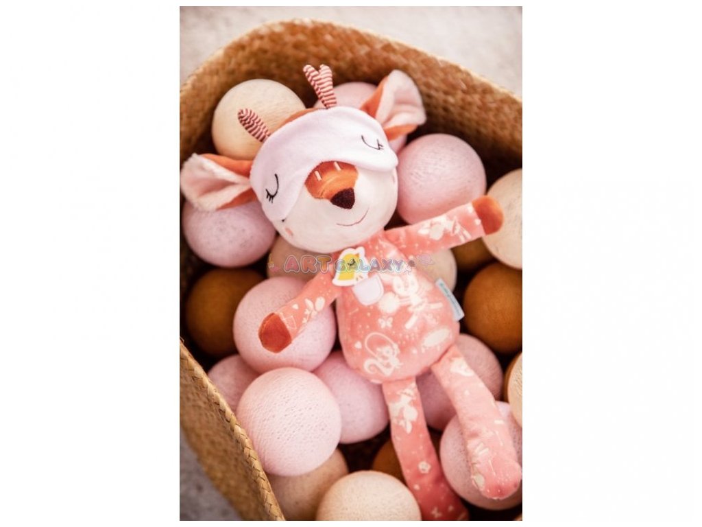 Jelínek Stella má na sobě kouzelné pyžamo s maskou na spaní, které ve tmě svítí. Jemné světlo uvolňuje stres a působí příznivě na zklidnění dětí v postýlce. Hračku je potřeba nejprve nasvítit na světle.