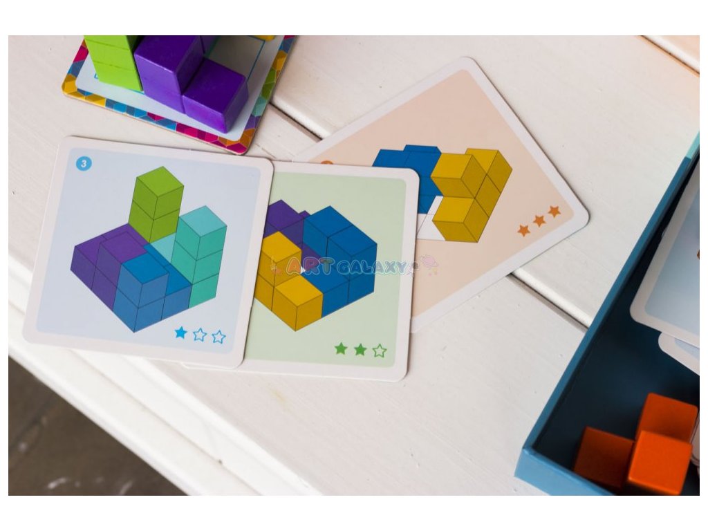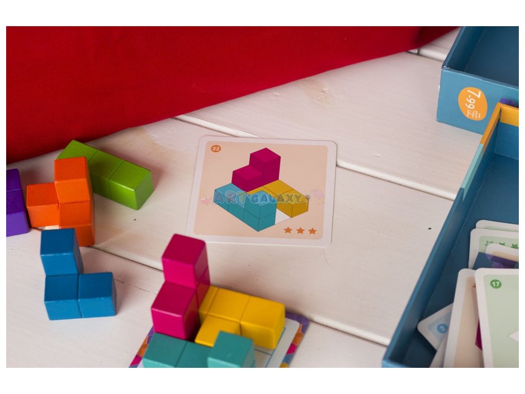 Logická hra pro děti od 7 let, ale zvládnu i mladší. Procvičte prostorovou představivost a skládejte kostičky, které jsou spojeny do různých tvarů podle předloh. Hru máme vyzkošenou a baví opravdu i dospělé.