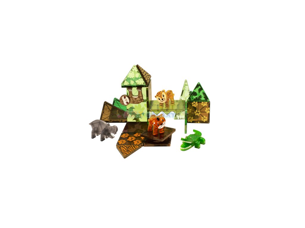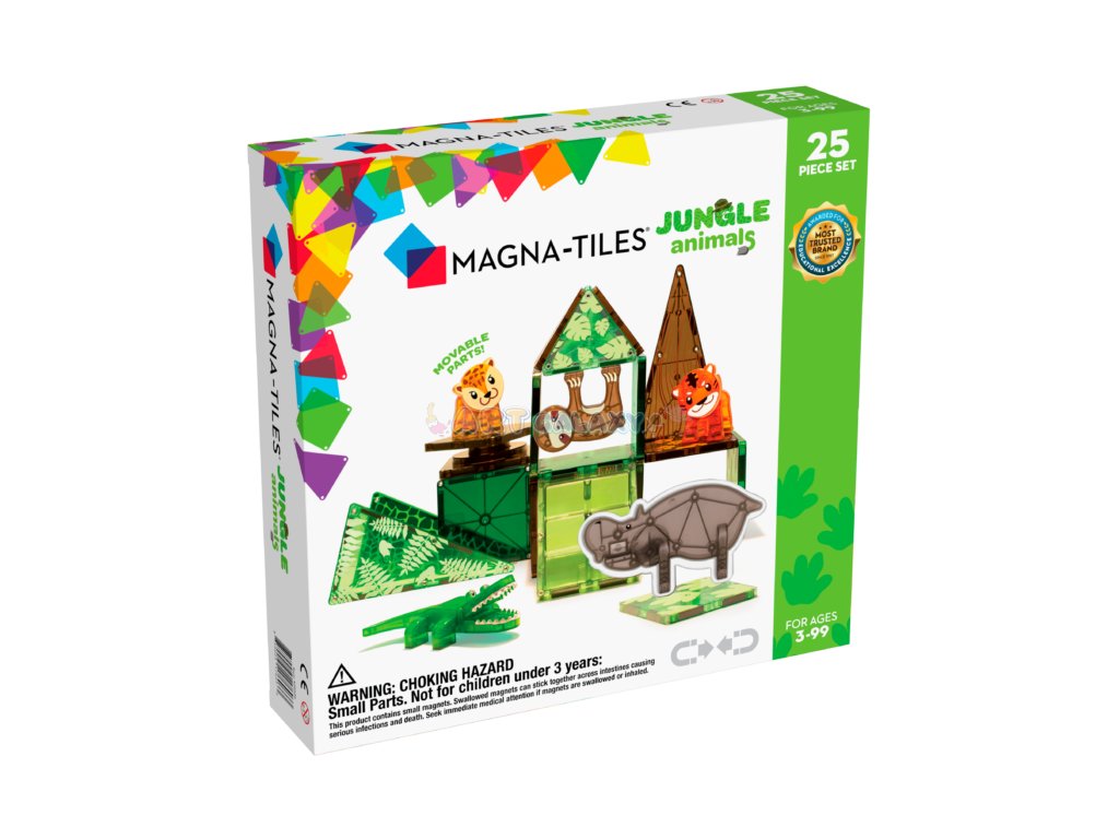 Magna-Tiles Jungle Animals 25-dílná sada obsahuje různé stavební dílky a zvířata, které umožňují dětem vytvářet tropické lesní scenérie. Sada obsahuje 10 čtverců, 4 rovnoramenné trojúhelníky, 4 rovnostranné trojúhelníky, 1 otočnou základnu a schody. Dílky jsou navrženy tak, aby byly snadno ovladatelné malými rukama a umožňovaly jednoduché spojení s uspokojivým "kliknutím"