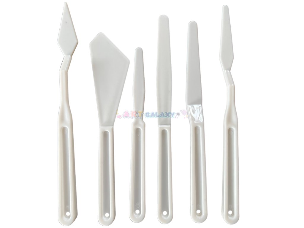 Sada plastových malířských špachtlí různých velikostí je skvělým pomocníkem při míchání barev či vytváření výtvarných děl či strukturovaných obrazců. Každá špachtle má jiný tvar pro jiný efekt a je s nimi možné míchat různé množství barvy dle velikosti špachtlí.