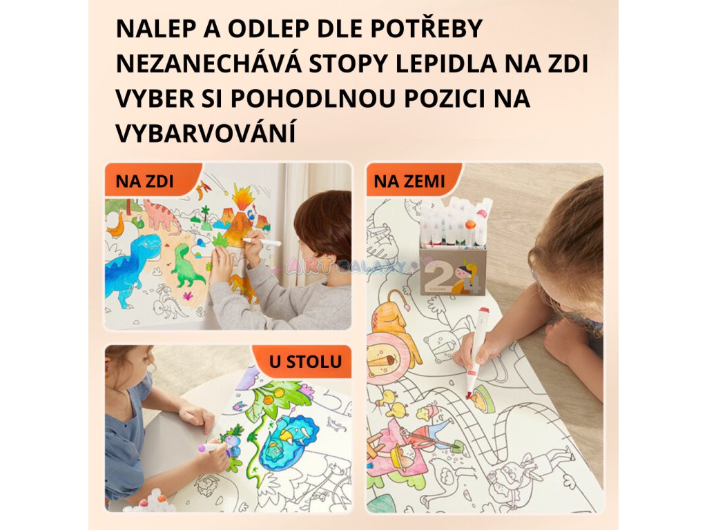 Omalovánku lze snadno nalepit i sundat například na zeď nebo podlahu.