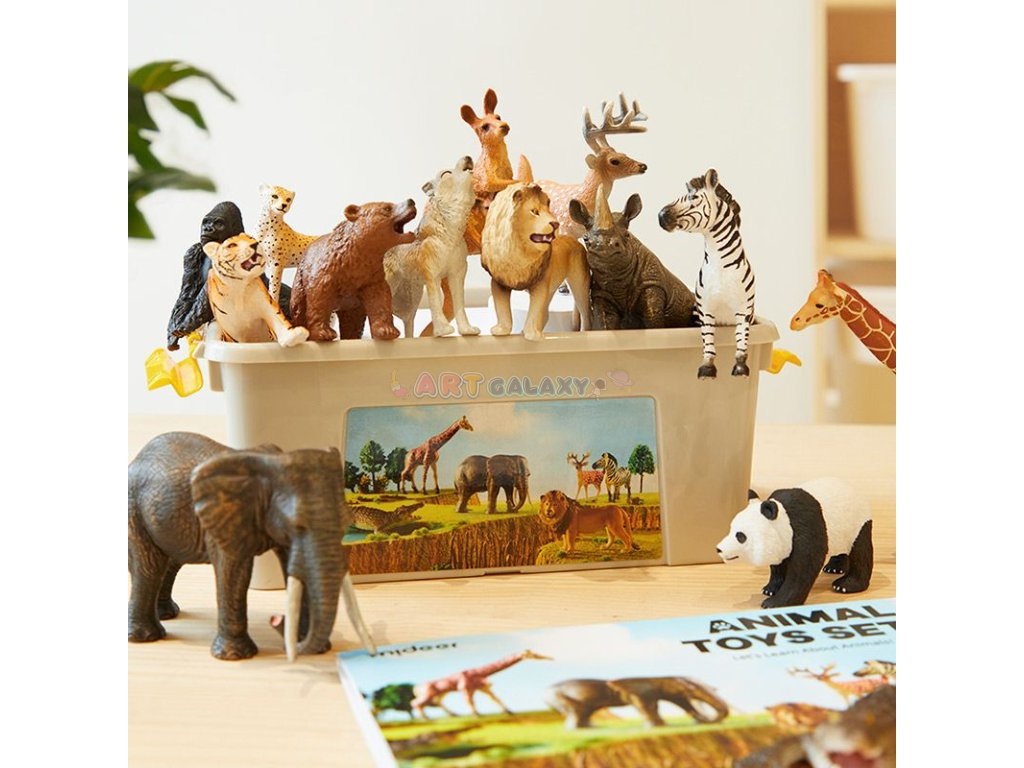 Sada obsahuje tyto zvířátka: slon, gorila, krokodýl, vlk, nosorožec, žirafa, panda, lev, jelen, klokan, tygr, medvěd, leopard, velbloud, zebra.