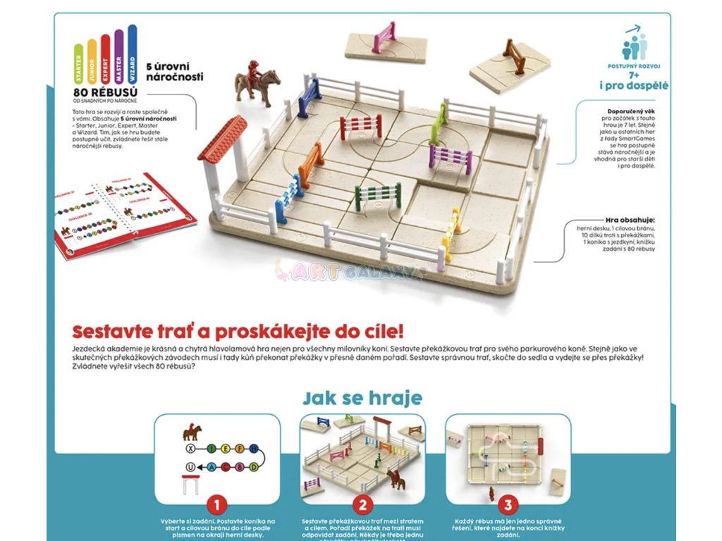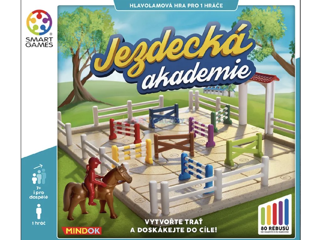 Hra Jezdecká akademie z dílny Smart Games, kterou u nás vydává nakladatelství Mindok, patří mezi skvěle zpracované logické hry, které zaujmou na první pohled svým designem a na druhý svou náročností. Ačkoliv design ve stylu jezdecké dráhy s překážkami a figurkou koníka s jezdcem cílí spíše na mladší hráče, obtížnost rébusů dokáže překvapit i dospělé.