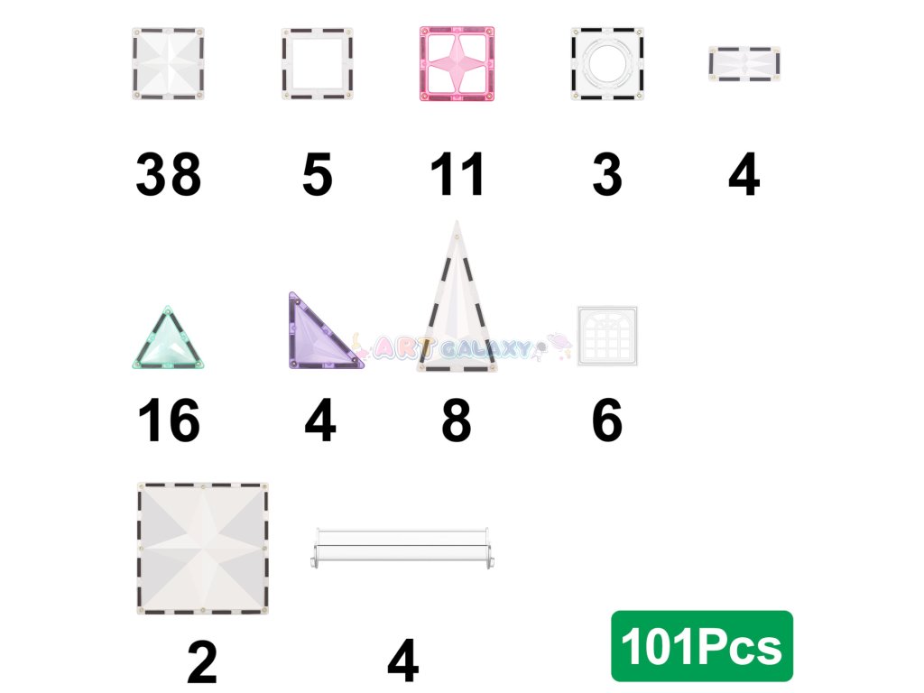 - 101 magnetických dílků v pastelových barvách (světle oranžová, růžová, zelená, fialová, modrá, průhledná)