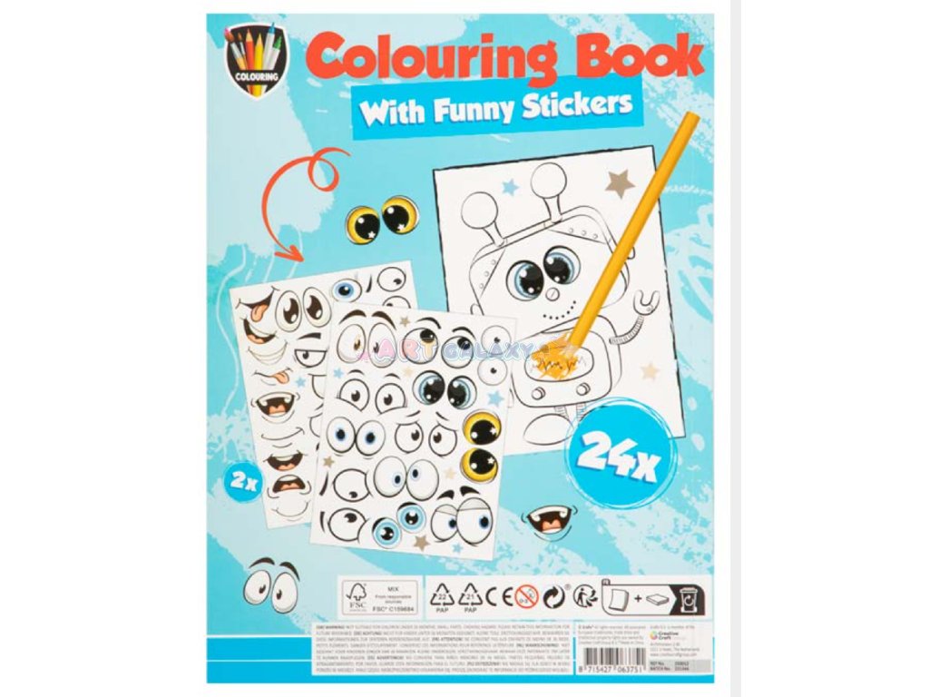 Omalovánky s vtipnými samolepkami obsahují 24 obrázků k vymalování a 2 listy samolepek očí a úst k dotvoření obličejů milých postaviček. Rozměr: A4