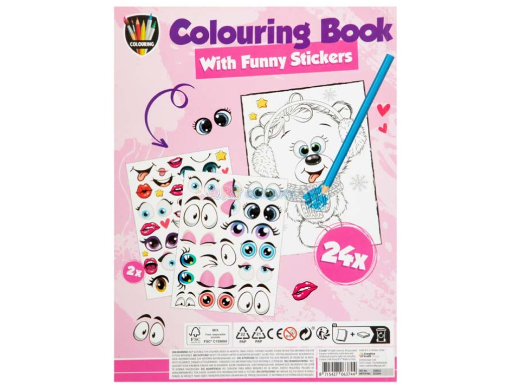 Omalovánky s vtipnými samolepkami obsahují 24 obrázků k vymalování a 2 listy samolepek očí a úst k dotvoření obličejů milých postaviček. Rozměr: A4