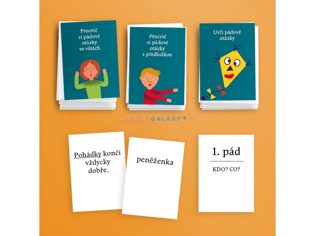 A jak naučit pádové otázky? Čím začít a jak postupovat dál? Nejprve je důležité naučit se pořadí a znění pádových otázek. K tomu slouží jednak knižní příběhy, ale také prvních sedm kartiček, ve kterých se děti učí pády řadit. Jakmile dítě tuto řadu zvládá, přichází na řadu rozpoznávání pádu podstatných jmen ve slovních spojeních a poté ve větě. K tomuto je určeno zbývajících 70 kartiček. Přehledová karta slouží jako takový “tahák”, aby dítě nabylo při určování pádů jistotu.