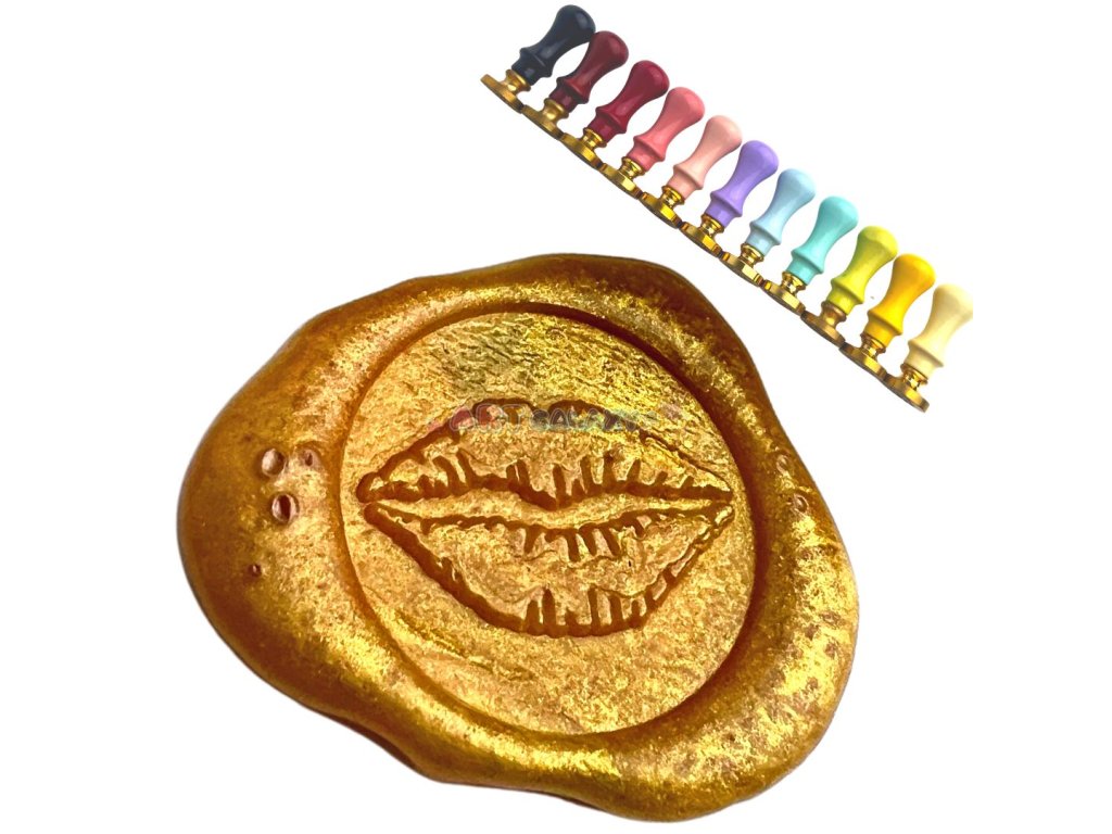 Pečetidlo s motivem Rty je ideální pro dekorování, zdobení obálek, přání, jmenovek a další zdobení. Ozdobte své produkty pečetí. Přidejte pečeť na domácí produkty: ať už víno nebo marmelády. Ozdobte, vše čemu chcete dodat větší eleganci a sváteční charakter. Objevujte kouzlo pečetění a vraťte se s námi zpět do minulosti, kdy každé psaní bylo zdobeno touto elegantní technikou. Pečetidlo má mosaznou hlavu s vyraženým motivem a je doplněno dřevěnou rukojetí v různých barevných variantách.