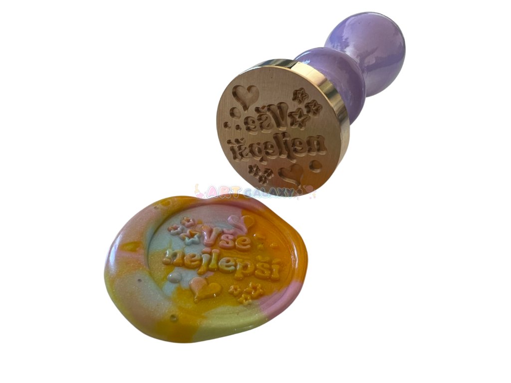Pečetidlo s nápisem Vše nejlepší je ideální pro dekorování, zdobení obálek, přání, jmenovek a další zdobení. Ozdobte své produkty pečetí. Přidejte pečeť na domácí produkty: ať už víno nebo marmelády. Ozdobte, vše čemu chcete dodat větší eleganci a sváteční charakter. Objevujte kouzlo pečetění a vraťte se s námi zpět do minulosti, kdy každé psaní bylo zdobeno touto elegantní technikou. Pečetidlo má mosaznou hlavu s vyraženým motivem a je doplněno dřevěnou rukojetí v různých barevných variantách.