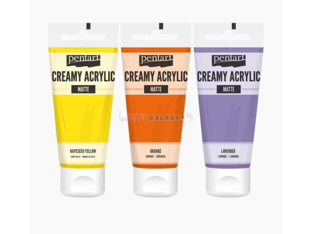 Matné akrylové barvy značky Pentart. Krásné zářivé barvy s vysokým obsahem pigmentu, jemná krémová konzistence, rychleschnoucí, jsou použitelné na všechny druhy povrchů a po zaschnutí voděodolné.