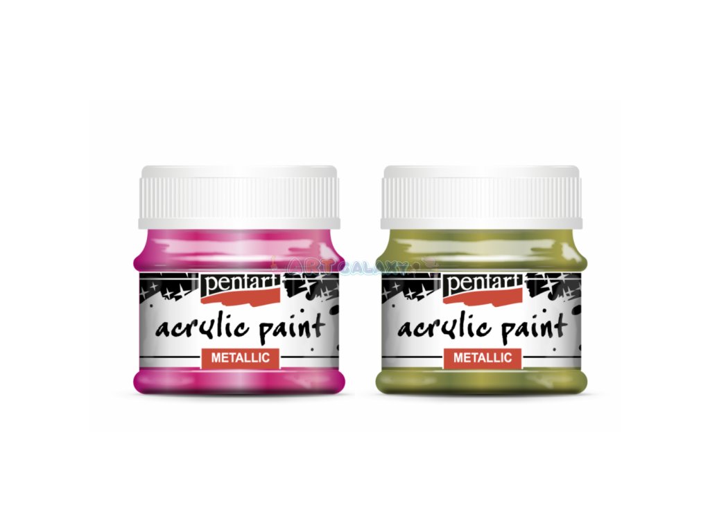 Metalická akrylová barva značky Pentart. Krásné zářivé barvy, jemnější krémová konzistence, rychleschnoucí, jsou použitelné na všechny druhy povrchů a po zaschnutí voděodolné.