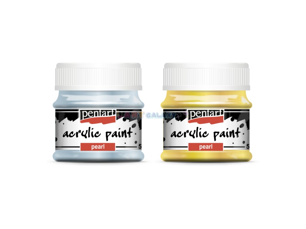 Akrylová perleťová barva od maďarské značky Pentart. Perleťový efekt vytváří právě tyto populární barvy. Perleťový efekt mění barevné spektrum z každého úhlu pohledu. Barvy jsou po zaschnutí voděodolné. Jsou baleny v průhledných plastových nádobkách se širokým šroubovacím víčkem.