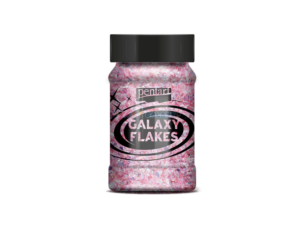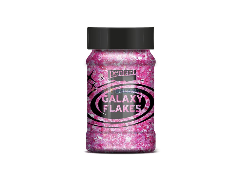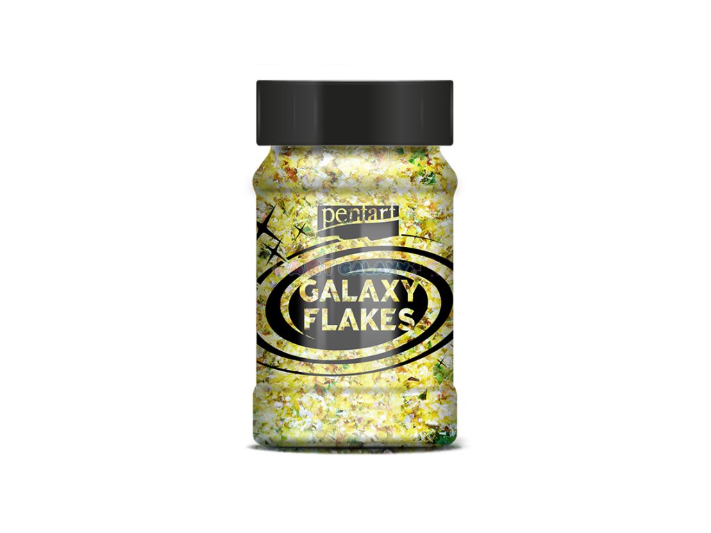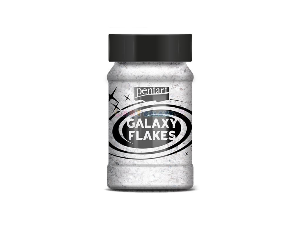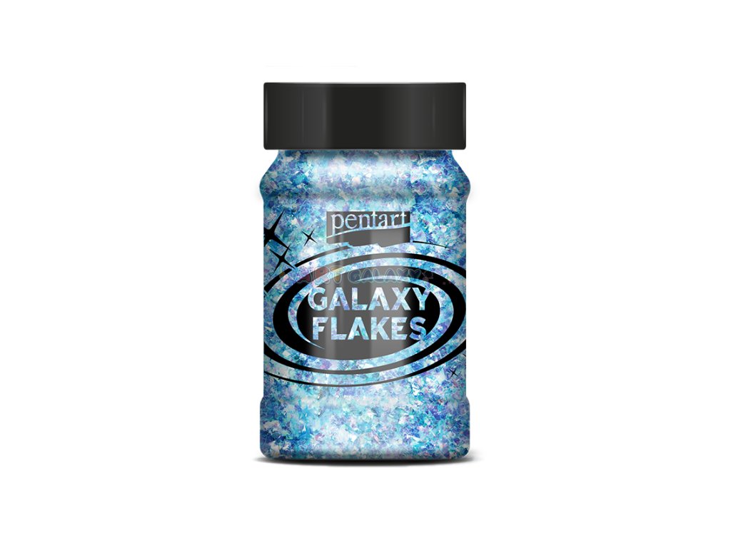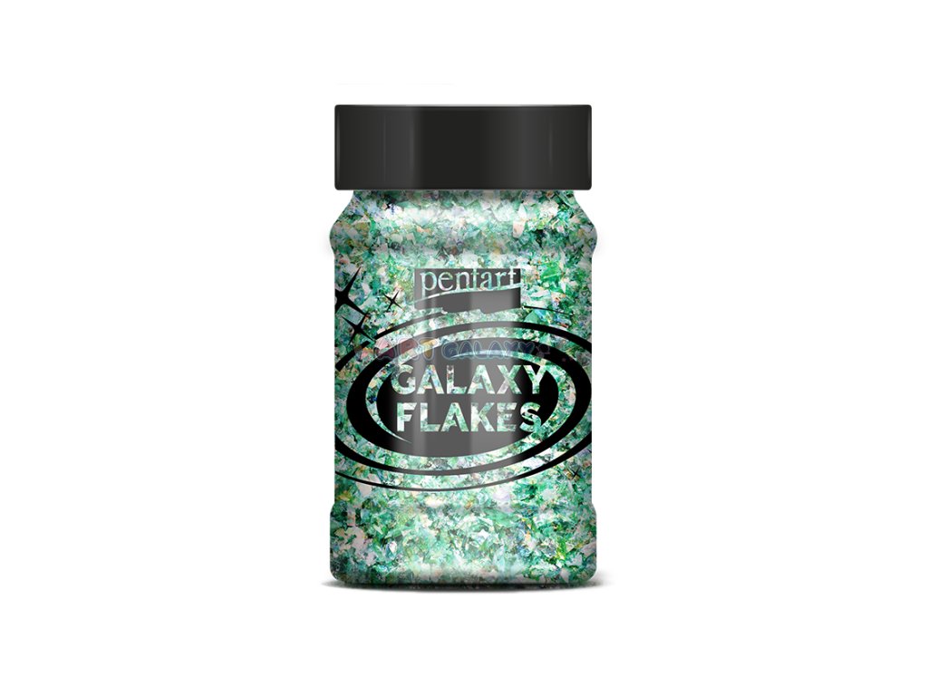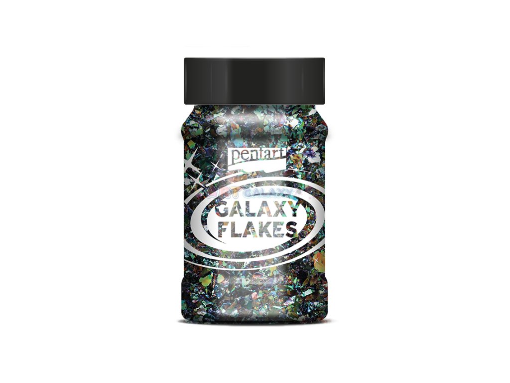 Galaxy Flakes značky Pentart jsou duhové vločky nepravidelného tvaru vhodné k dotváření dekorací. Je možné je lepit či vmíchat do dekoračních gelů, pryskyřice či laků. Balení obsahuje 15 gramů metalických vloček ve 100 ml lahvičce.