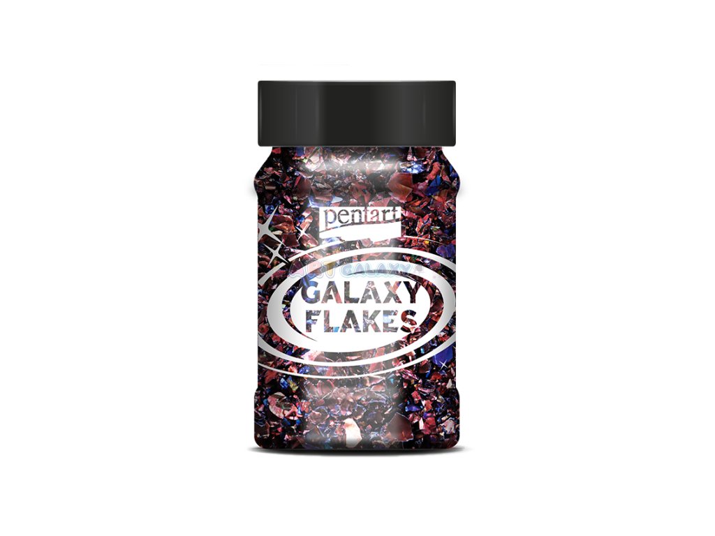 Galaxy Flakes značky Pentart jsou duhové vločky nepravidelného tvaru vhodné k dotváření dekorací. Je možné je lepit či vmíchat do dekoračních gelů, pryskyřice či laků. Obsahuje červené zlato, které má záblesky oranžovo-červeno-zlaté barvy, kdy je efekt odlišný na světlém a tmavém povrchu a při odrazu světla. Použijte s lepidlem nebo je vmíchejte do průhledných gelů, pryskyřice či laků. Baleno v plastové lahvičce.