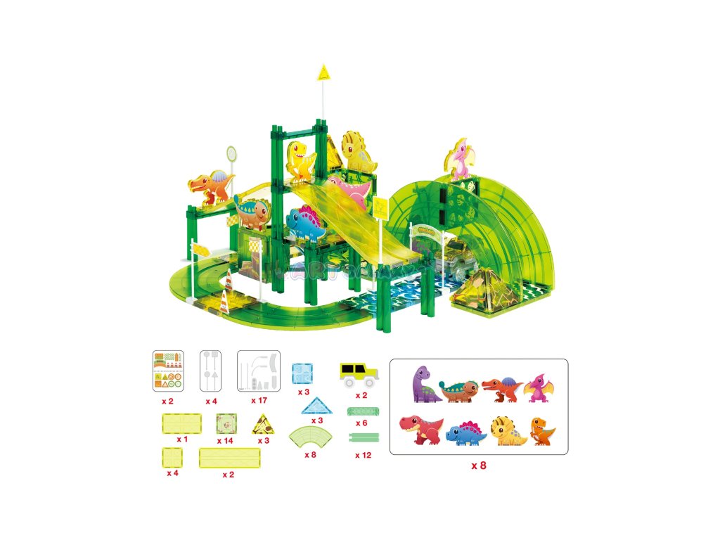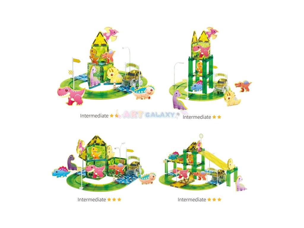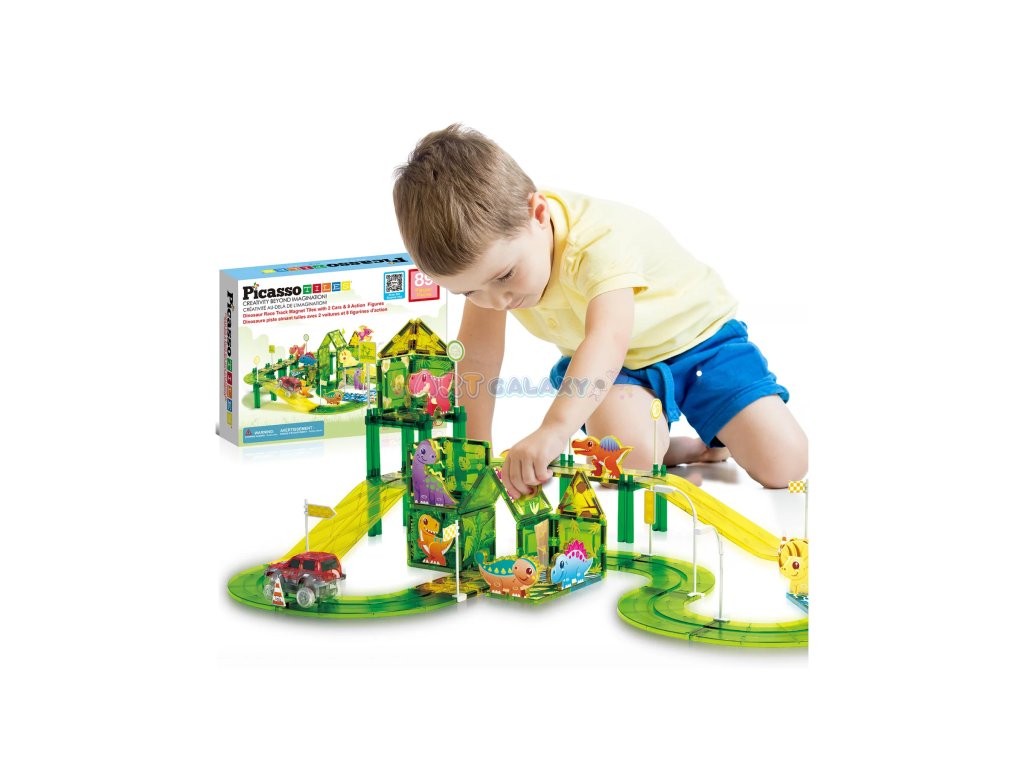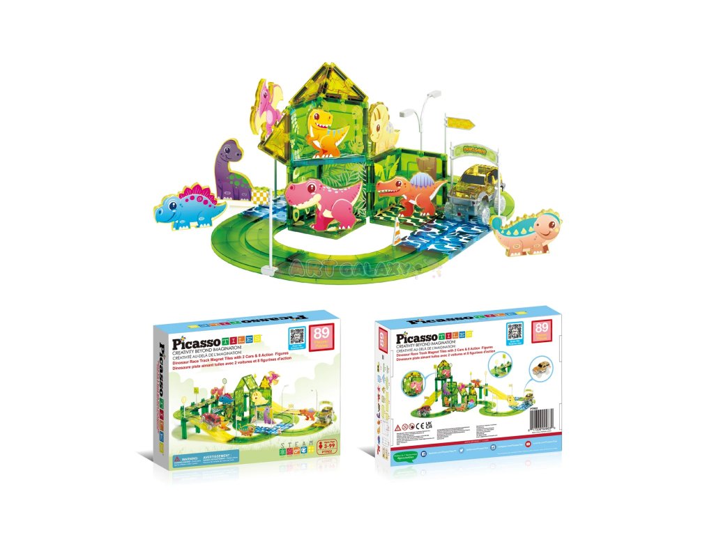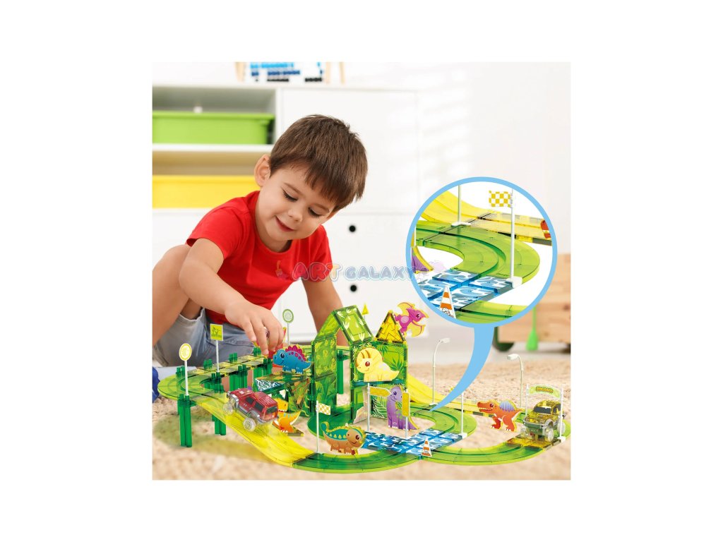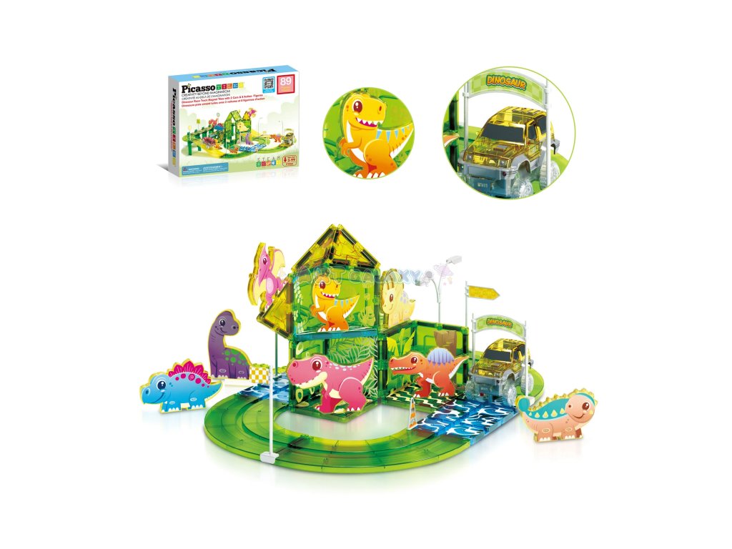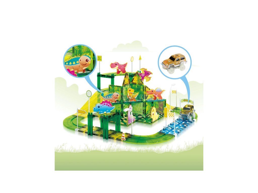 Tato sada od PicassoTiles kombinuje oblíbené magnetické stavebnice s rychlými autíčky a dinosauří tematikou. Děti si mohou samy postavit funkční závodní dráhu s křivkami, sjezdy a podpěrami, přidat dinosauří figurky a dopravní značky a pak závodit s dvěma bateriovými autíčky.