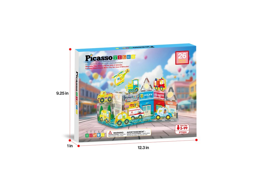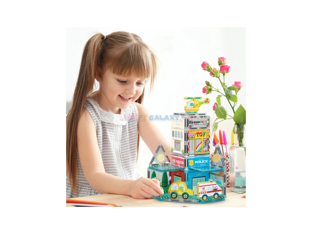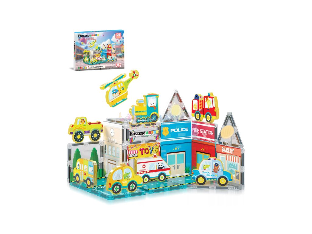Sada Metro City obsahuje potištěné magnetické dílky a 8 vozidel, se kterými si děti mohou vytvořit ulice, domy, silnice i dopravní scénky podle své fantazie.