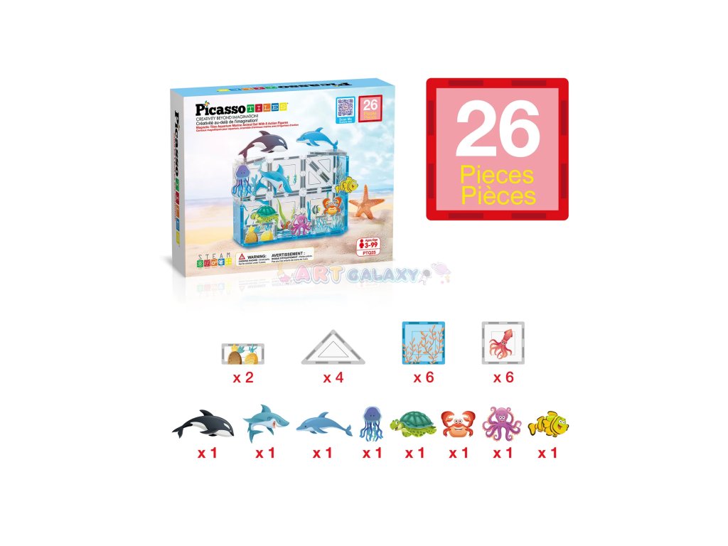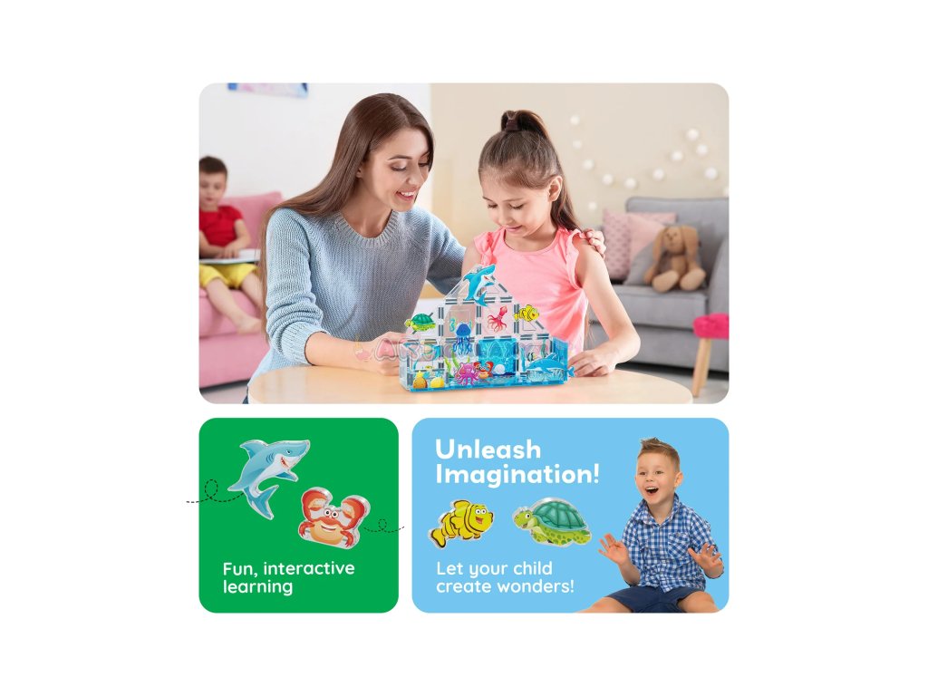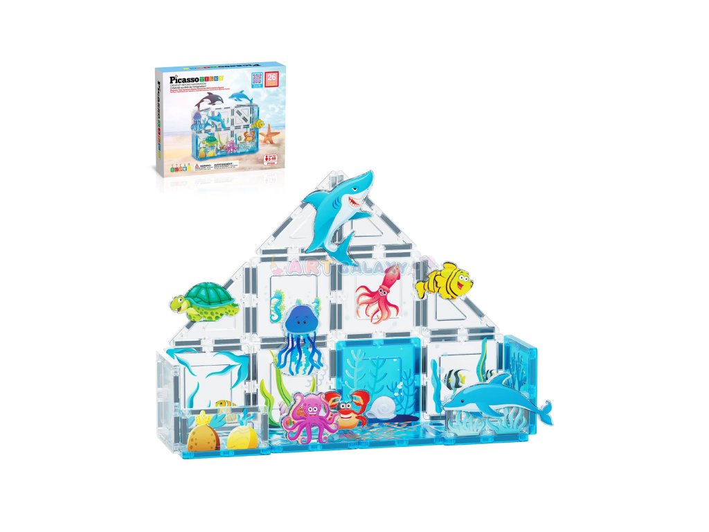 Sada Mořský svět přináší potištěné magnetické dílky a 8 figurek mořských živočichů, se kterými si děti mohou vytvořit vlastní akvárium nebo podmořskou scénu plnou fantazie.
