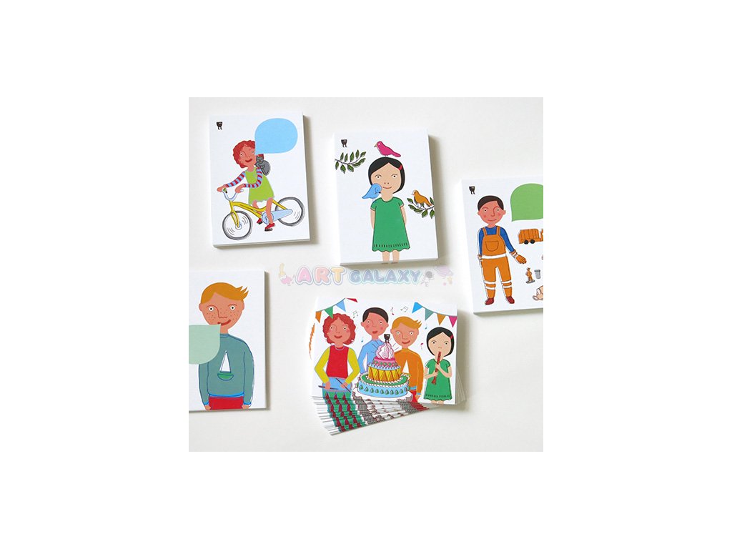 Sada pěti pohledů pro různé příležitosti – k narozeninám, nebo třebas při první jízdě na kole. Cokoliv vás napadne. Stačí vepsat svůj vzkaz do bubliny od úst Matyldy, Kvida a Aloise a poslat kamarádům do světa!