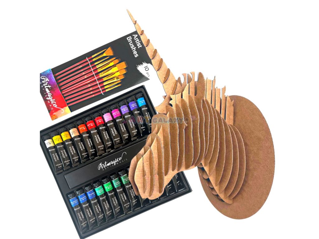- sada obsahuje 3D dekoraci ve stylu jednorožce, akrylové barvy Artmagico v prémiové kvalitě a štětce