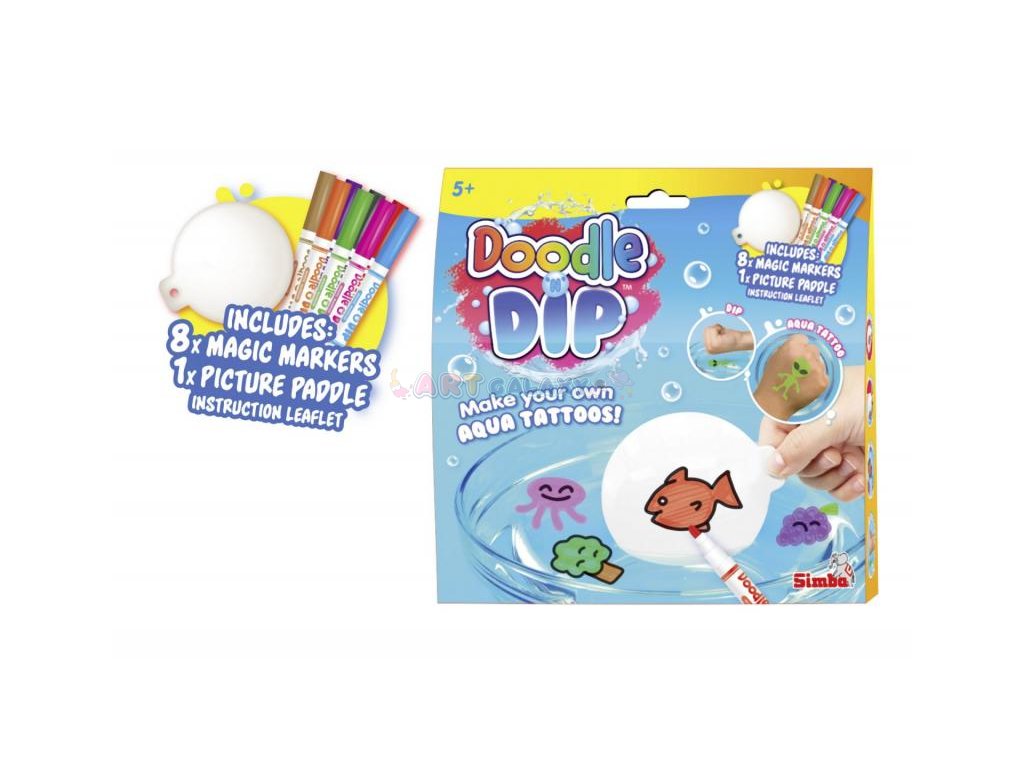 Simba - Vodní tetování Doodle N Dip přináší skvělý způsob, jak zabavit děti a zároveň rozvíjet jejich kreativitu. Tetování je snadno použitelné – jednoduše naneste motiv na kůži, přiložte navlhčenou houbičku a jemně zatlačte. Po několika sekundách odstraníte papír a zůstane jen krásný tetovací design.