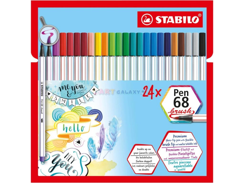 STABILO Pen 68 Brush 24 ks Sada "ARTY" je dokonalá sada pro všechny milovníky umění a kreativity. Tato sada obsahuje 24 vysoce kvalitních fixů s flexibilními štětcovými hroty, které umožňují širokou škálu kreativních technik a efektů. S intenzivními a živými barvami STABILO Pen 68 a variabilními možnostmi štětcového kreslení vám tato sada umožní vyjádřit vaše umělecké vize s maximální precizností a expresivitou. Baleno v elegantní a praktické "ARTY" krabičce je tato sada ideálním doplňkem pro umělce všech úrovní dovedností.