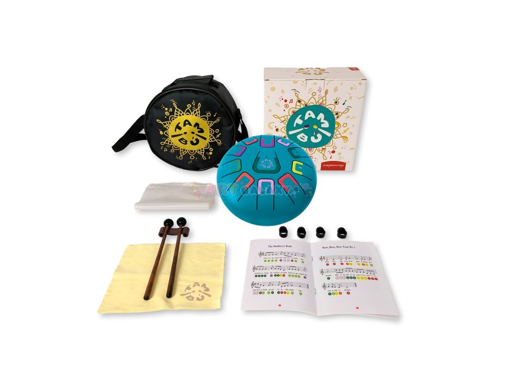 TAMBÚ je melodický kovový bubínek laděný v G dur, který okouzlí sametovým zvukem a barevným značením not. Perfektní pro děti i dospělé – bez předchozí zkušenosti s hudbou!