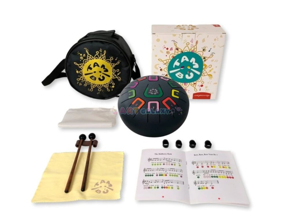 TAMBÚ je melodický kovový bubínek laděný v G dur, který okouzlí sametovým zvukem a barevným značením not. Perfektní pro děti i dospělé – bez předchozí zkušenosti s hudbou!
