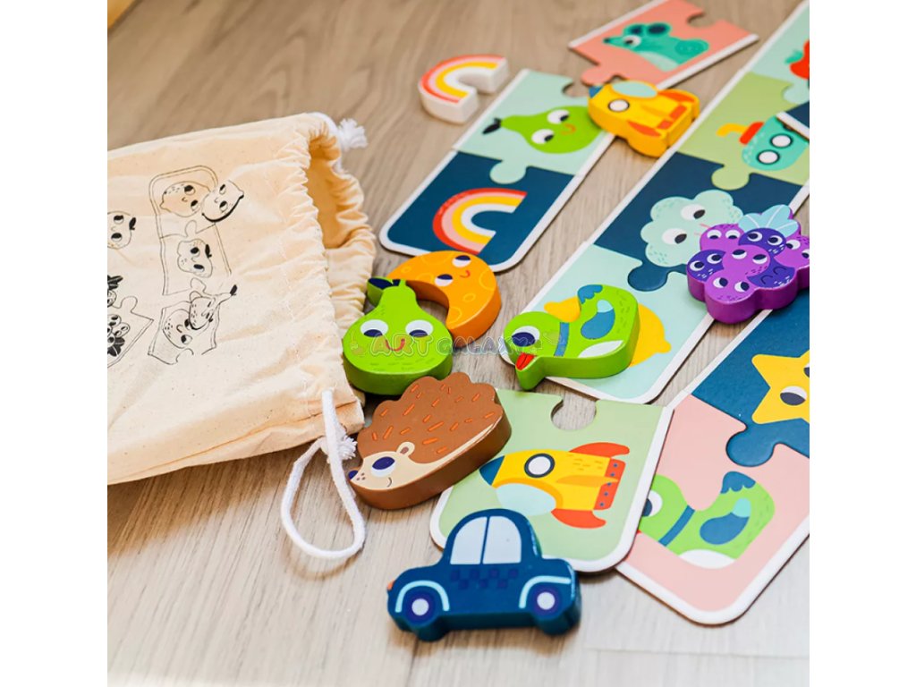 Tato hračka je ideální pro rodiče, kteří hledají smysluplné hry podporující přirozený vývoj dítěte. Stačí si vybrat obrázek a strčit ruku do bavlněného sáčku – dítě se snaží najít dílek, který odpovídá kartičce, pouze pomocí hmatu. To pomáhá posilovat jemnou motoriku, koncentraci a především hmatové vnímání.