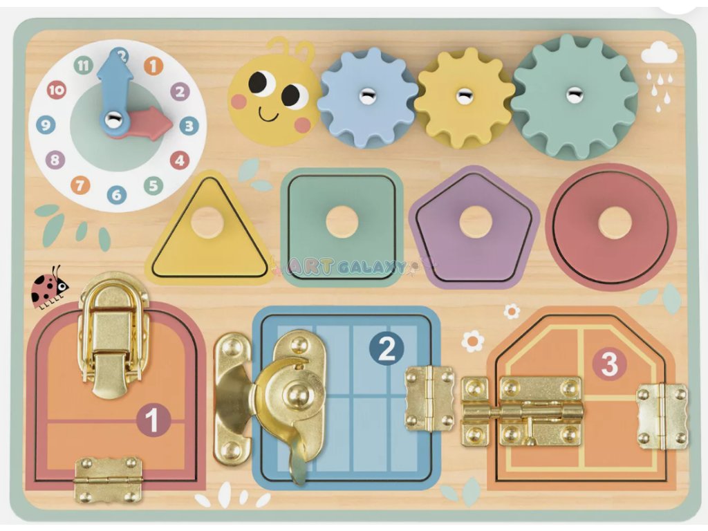 Tooky Toy Activity Board Pastel není jen krásná na pohled, ale hlavně praktická. Každý prvek na této tabuli má svůj smysl – rozvíjí dovednosti dítěte přirozeně a zábavně. Děti se učí soustředit, manipulovat s tvary, rozpoznávat vztahy a koordinovat pohyby rukou s očima.