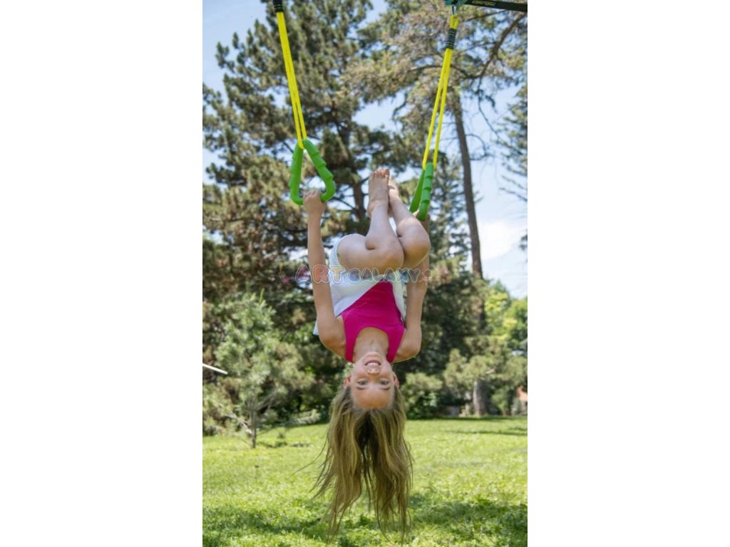 - Obsah balení: slackline, ráčna, gymnastické kruhy, houpačka, připevňovací body