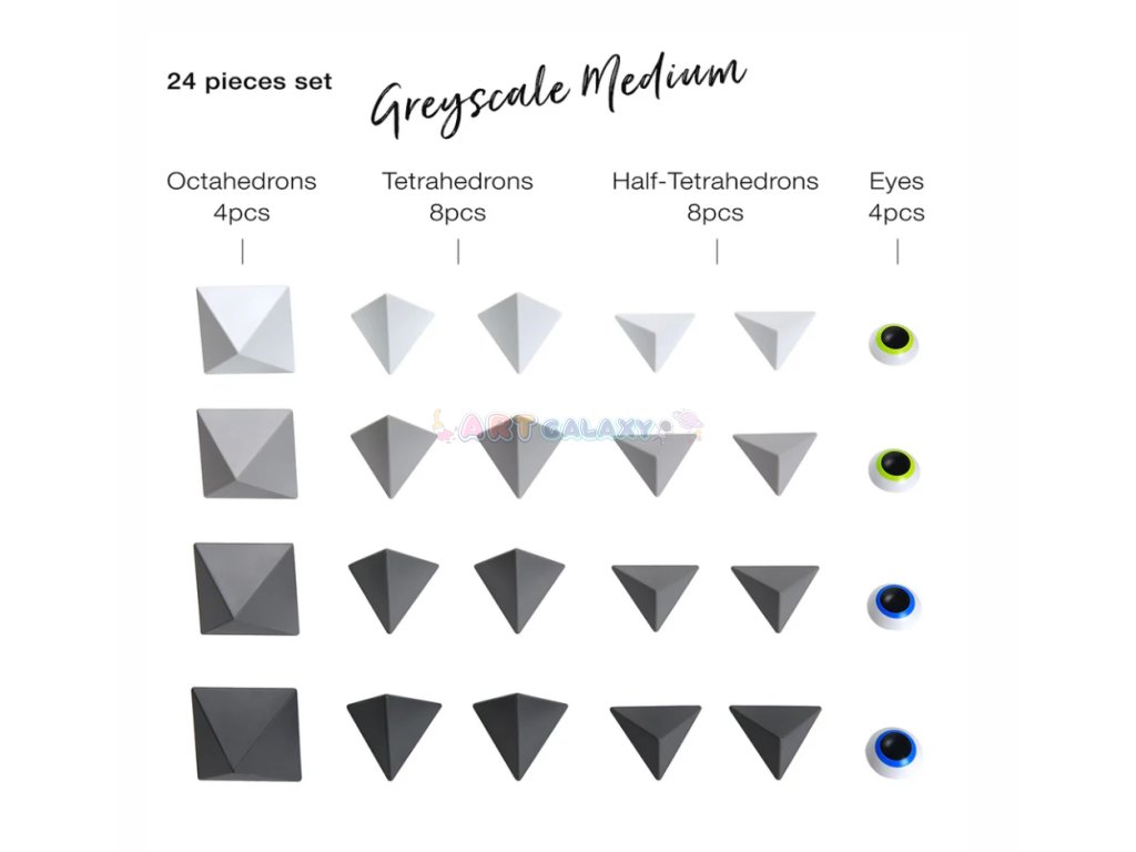 - Obsah balení: 24 magnetických dílků (různé tvary v odstínech šedé)