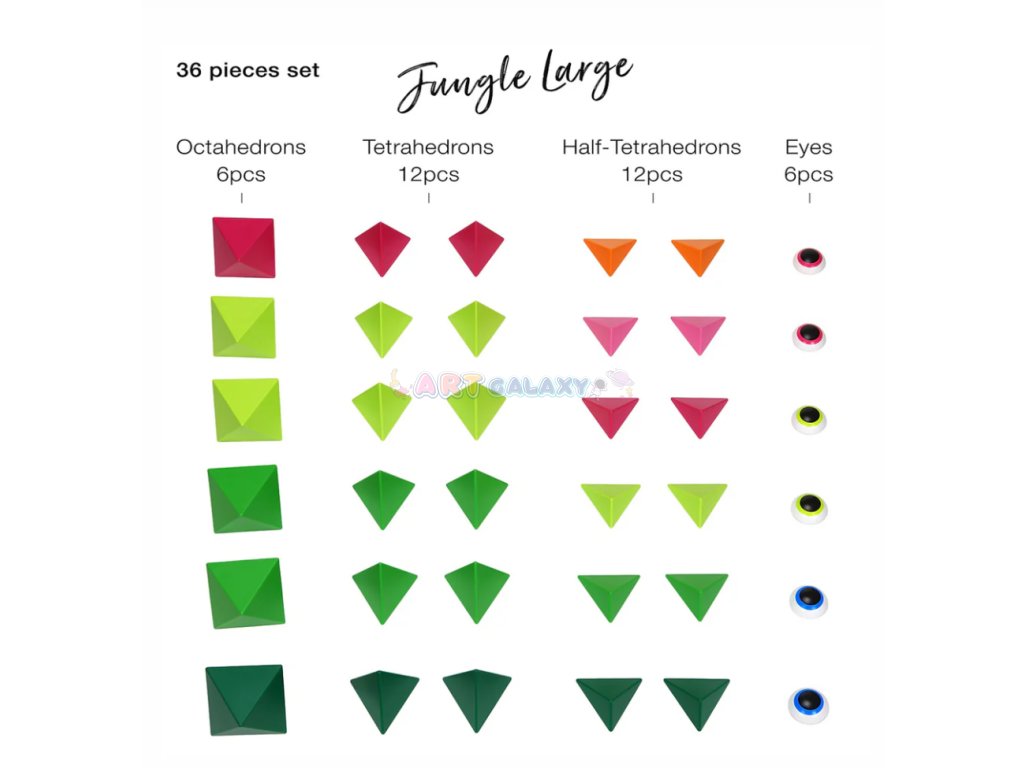 Sada Jungle Large je určena pro děti, které si chtějí hrát bez omezení. 36 dílků nabízí neomezené možnosti kombinací a stavby rozsáhlých projektů – od lesních zvířat až po celé krajiny. Magnetické tvary (trojúhelníky, čtverce, hexagony) se snadno spojují a drží pevně, což dětem umožní soustředit se na samotnou kreativitu.