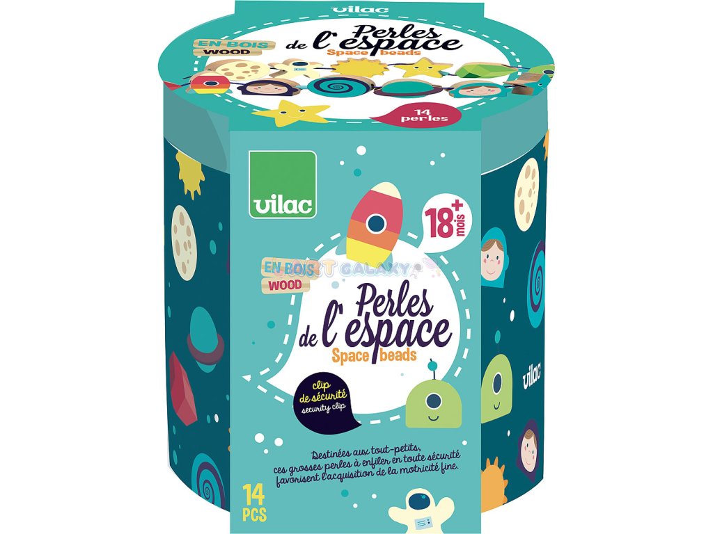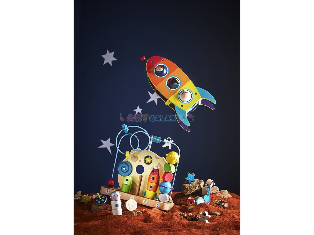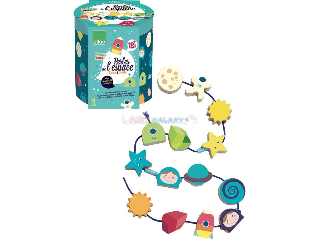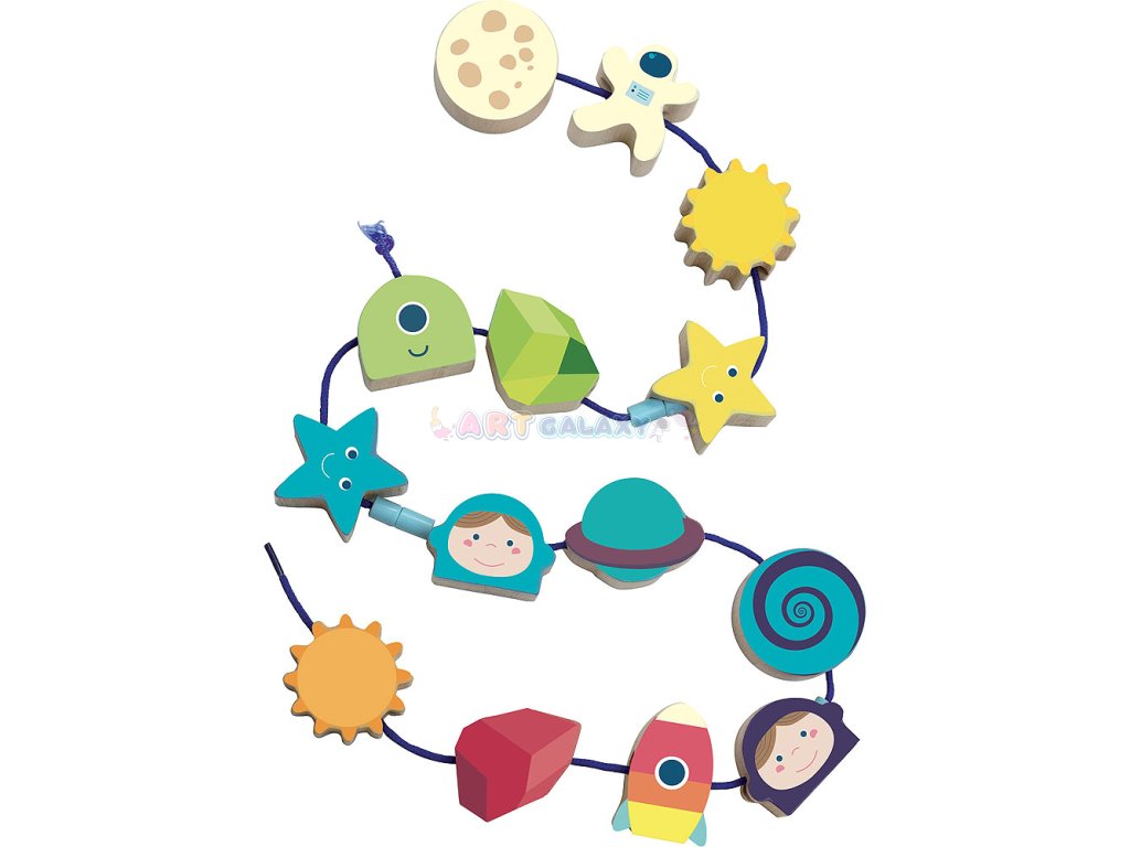 Krásná provlékačka v motivu vesmíru. V kompaktním balení najdete 14 ilustrovaných dřevěných korálků (např. astronaut, měsíc, slunce, raketa), které děti mohou navlékat na textilní šňůrku. Hračka pomáhá s rozvojem jemné motoriky. Vybaveno bezpečnostními sponami. Vhodné od 18 měsíců.