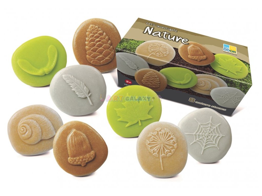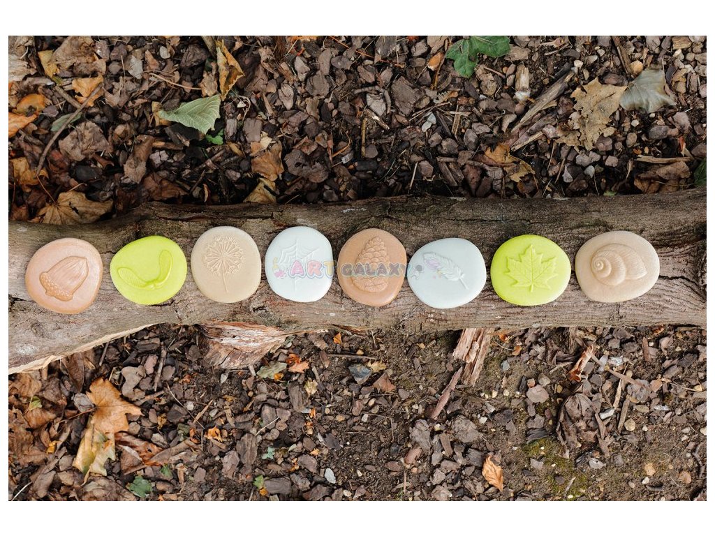 Sada obsahuje osm kamenů: žalud, semínko pampelišky, peříčko, šiška, šnečí ulita, pavučina, platanový list, semena platanu. Kameny měří cca 80 mm. Bezpečné pro 2+.